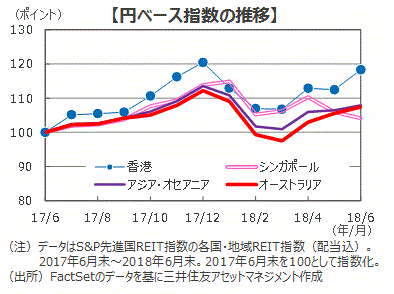 ■18年6月の騰落率を円ベースでみると、シンガポール市場は▲1.7%、香港市場は+5.2%、アジア・オセアニア全体では+1.4%と、現地通貨ベースを上回りました。一方、オーストラリア市場は+1.8%と現地通貨ベースを下回りました。