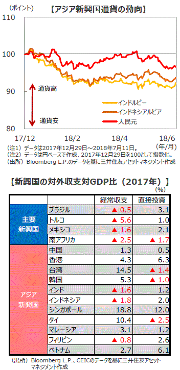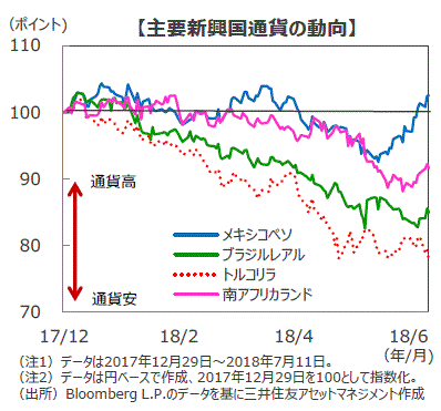 ■新興国通貨は、年初から米長期金利の上昇などを受けて調整しました。なかでも政治的に不安定な国や、経常赤字国の通貨の下落が大きくなっています。足元では、米中の貿易摩擦への懸念が高まるなかで調整が長引く傾向にあります。