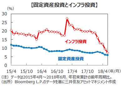 ■18年1~6月の固定資産投資は前年同期比+6.0%と、1~5月(同+6.1%)から伸び率がやや縮小しました。地方政府の債務抑制によりインフラ投資が同+7.3%と、1~5月(同+9.4%)から減速していることが背景です。