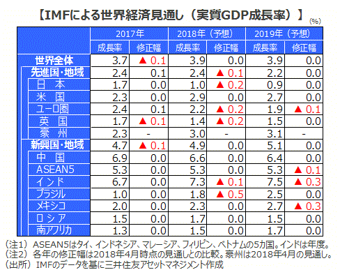■7月17日に発表された国際通貨基金(IMF)の世界経済見通しによれば、実質GDP成長率は2018年、19年共に3.9%と、18年4月の見通しが据え置かれました。但し18年の見通しは、先進国・地域では、日本、ユーロ圏、英国の成長率が4月時点から下方修正されました。一方、米国は減税と政府支出の増加により堅調さを維持するとの見通しで、先進国・地域間で成長ペースがばらつく予想となっています。