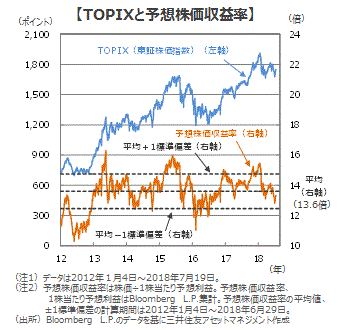 ■TOPIXの予想株価収益率は7月19日現在13.3倍と2012年以降の平均値(13.6倍)を下回っており、株価水準に割高感はありません。企業業績(予想利益)が底堅く推移する中で株価が下落したため、予想株価収益率が低下しました。