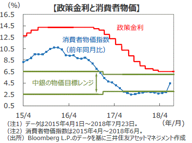 ■中銀は、2016年10月以降今年の3月まで利下げを12会合連続で行ってきましたが、通貨レアルの下落を受けて、5月の金融政策決定会合以降は政策金利を据え置いています。これまでの金融緩和サイクルは終了したとみられ、足元の消費者物価が中銀の目標に近づくなか、中銀は当面現状の金融政策を維持すると思われます。