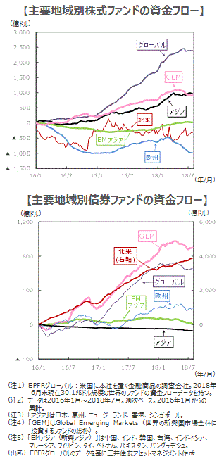 ■先進国の内訳を見ると「欧州」が▲89億ドルと5カ月連続で流出超となりましたが、「北米」が+101億ドルと前月102億ドルの流出超から流入超に転じました。 「アジア(注3) 」 が+21億ドル、「グローバル」も+16億ドルでした。新興国の内訳を見ると、新興国全体に投資する「GEM(注4)」が▲26億ドルでした。前月の▲116億ドルからは減少したものの3カ月連続の流出超でした。一方、「EMアジア(注5)」は▲7億ドルと9カ月ぶりに流出超に転じました。