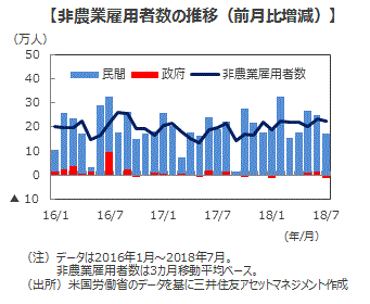 ■2018年7月の非農業部門雇用者数は、前月比15.7万人の増加となりました。