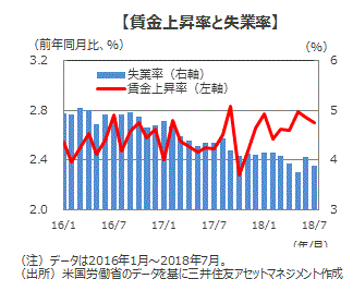 ■雇用統計が公表された8月3日の米国市場では、7月の雇用者数や、同月のISM非製造業指数が市場予想を下回ったこと等から、債券利回りが低下(債券価格は上昇)しました。一方、株式市場は、同月の雇用統計を、「労働市場の安定を示すものであり、FRBの漸進的な利上げ方針と整合的な内容」と評価。よって株価は、上昇しました。