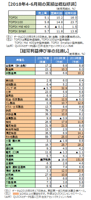 ■2018年度4-6月期決算が出そろいました(8月16日時点で東証一部上場銘柄数の99.9%。QUICK集計)。決算内容を見ると、前年同期比で売上高が+5%、営業利益が同+10%、経常利益が同+16%と、増収、営業増益、経常増益が続いています。事前コンセンサスに比べて総じて上振れた模様です。