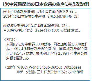 ■米中共に制裁措置によって関税率分だけ制裁対象分の生産活動が低下すると仮定すると、日本の全産業ベースで生産が0.04%減少するとの結果になりました。間接的な効果を加えればさらに影響が強まること、試算の前提となった2014年当時に比べ中国経済が着実に拡大していることなどから、仮に10倍としても生産額は0.4%程度の減少にとどまります。関税のかけあいが米中の2国間にとどまるのであれば、日本企業の生産活動への影響は限定的と言えそうです。