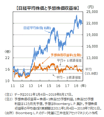 ■日経平均株価の予想株価収益率(12カ月先予想利益ベース)は8月17日現在15.1倍と2011年以降の平均値(15.8倍)を下回っており、株価水準に割高感はありません。日本株式市場は、米中貿易摩擦の拡大懸念や米国の保護主義的な通商政策の強化が当面払拭されないことから、上値の重い展開が想定されます。米中貿易摩擦の解消に一定の目途が立ち企業活動への懸念が払拭されれば、予想株価収益率が過去の平均並みに戻ることも可能と考えられます。その場合は、2万3,000円台への回復も視野に入ると見られます。