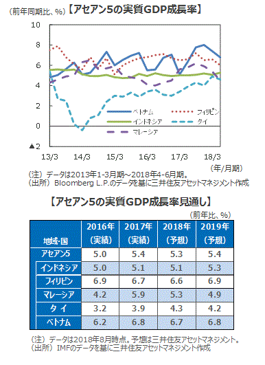 ■東南アジア諸国連合(ASEAN)の主要5カ国(インドネシア、フィリピン、マレーシア、タイ、ベトナム)の2018年4-6月期の実質GDP成長率(前年同期比。以下、成長率)は1-3月期に比べ、インドネシアが加速したものの、他の4カ国は鈍化しました。