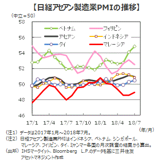 ■アセアンはこれまでの通貨安に加えて、一部諸国の引き締め政策により、景気マインドが悪化しやすくなっている点に注意が必要です。こうした中でも、日経アセアン製造業PMIを見ると、ベトナムが好調で、フィリピンも高水準を維持しています。タイも緩やかな上昇が続くなど経済環境は良好です。高い経済成長が期待できるフィリピンや、ベトナム、成長の加速が期待できるタイは中長期的に株価上昇が見込めそうです。