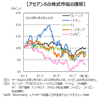 ■18年7月以降戻り基調となっていたアセアンの各株式市場は8月上旬に頭打ちとなり、調整含みの展開となりました。
