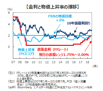 ■景気の拡大に伴い、物価も緩やかに上昇してきました。米連邦準備制度理事会(FRB)が重視する個人消費支出(PCE)コアデフレーターの7月は、前年同月比+2.0%となり、FRB目標値に到達しました。ただし、物価の上昇に加速感はありません。インフレ期待の安定等を考え合わせると、ここからさらに大きく上昇する可能性は低いでしょう。