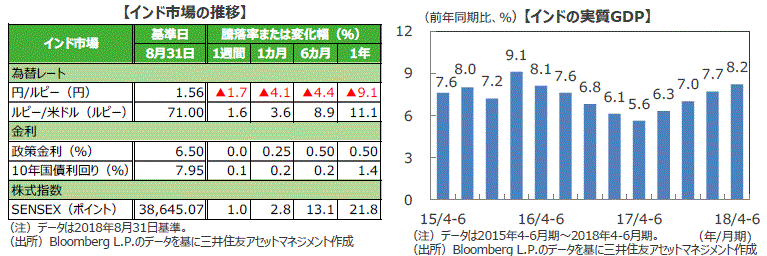 ■インド統計局が8月31日に発表した、2018年4-6月期の実質GDP成長率は前年同期比+8.2%と、市場予想(ブルームバーグ集計、同+7.6%)を上回り、1-3月期の同+7.7%から加速しました。2016年1-3月期以来の高い伸びとなり、主要国の中で最も高い経済成長が続いています。