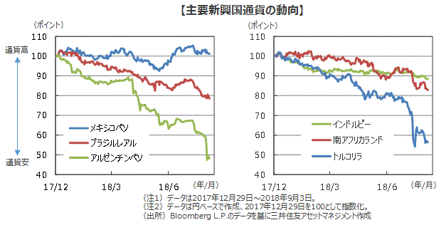 ■アルゼンチンペソは、8月29日にマクリ大統領が、国際通貨基金(IMF)に融資枠(500億ドル)に基づく融資の前倒し執行を要請したことから資金繰りの悪化懸念が表面化し、急激な下落につながりました。トルコリラの急落は、米国人牧師の拘束を巡る米経済制裁に端を発するなど、トルコ固有の問題に起因してはいるものの、経常赤字の大きさや的確な金融政策が行われないことへの懸念などが燻っています。いずれの通貨も、引き続き不透明感の強い展開が予想されます。