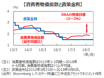 ■一方、18年4-6月期の消費者物価指数(異常値を除外したトリム平均値)上昇率は、前年同期比+1.9%と、豪州準備銀行(RBA)の目標レンジである+2~+3%の下限を下回っています。