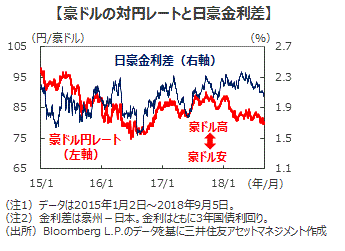 ■新興国通貨の下落を受け、リスク回避の動きが強まったため、豪ドルの対円相場は80円近傍での神経質な展開となっています。短期的には、トルコ情勢や米中貿易摩擦等が豪ドルの重石となる可能性がありますが、豪州経済の堅調さが下支えとなる見込みです。