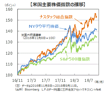 ■米国株式市場は8月29日に、ナスダック総合指数、S&P500種指数が最高値を更新しました。米国とメキシコが北米自由貿易協定(NAFTA)再交渉で大筋合意したことなどが好感されました。しかし、8月末にトランプ大統領が中国に対し、輸入品2,000億ドル相当分を対象とした追加関税を9月前半にも課す意向を示したことで、米国株式市場は再び調整しました。また、9月7日には、トランプ大統領が中国からの輸入品すべてに関税を賦課する用意があると警告したことを受けて下落しました。
