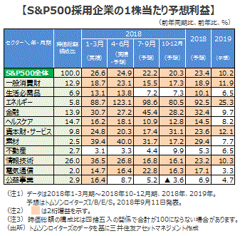 ■こうした中でも、米国株式市場が上昇基調を維持しているのは、米国企業の業績が好調であることが背景となっています。トムソンロイターズの調べによれば、S&P500採用企業の1株当たり利益は前年同期比で+20%超の増益が2018年下期も続く見通しです。2019年も通年で+10%台の成長が期待されます。