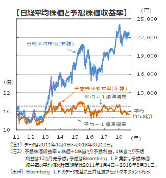 ■日経平均株価は2万2,500円を挟んだ狭いレンジで推移しています。9月12日の12カ月先予想株価収益率は15.0倍と2011年以降の平均値(15.8倍)を下回っており、割高感はありません。因みに、日経平均株価は年初の1月4日から9月12日まで3.8%下落していますが、予想株価収益率は16.2%低下しています。利益の堅調な伸びが予想株価収益率を大きく押し下げています。