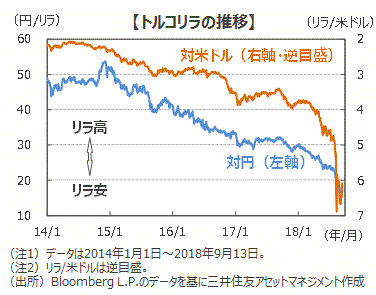 ■7月下旬以降トルコリラ相場は対ドルで大幅に下落しました。トルコリラの暴落の背景として、(1)極めて高いインフレ率と大きな経常赤字、(2)エルドアン大統領の強権的な政策運営、(3)対米関係の悪化、などが指摘されています。こうした中、中銀が市場予想を上回る利上げに踏み切ったことで、トルコリラは一先ず落ち着きました。しかし、エルドアン大統領の言動を見る限り、今回の利上げに対しても不信感を抱いている印象があり、また、対米関係も改善の兆しは見られません。政治情勢を引き続き注視する必要がありそうです。
