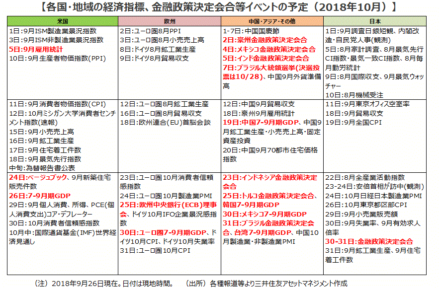 ■10月は7-9月期の実質GDP成長率に注目が集まりそうです。19日が中国で前年同期比+6.6%(前期同+6.7%)で緩やかに低下、26日が米国で前期比年率+2.9%(同+4.4%)と前期の反動で低下するも高成長を維持、30日がユーロ圏で前期比+0.4%(同+0.4%)と変わらず、と予想されます。