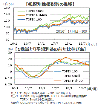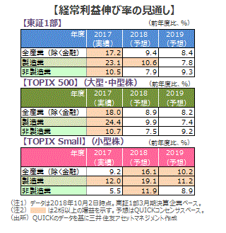 ■QUICKコンセンサスベースによれば、9月末現在、東証1部(除く金融)の2018年度経常利益は前年度比+9.4%と好調に推移する見込みです。中でも、TOPIX Small(小型株)は全産業(除く金融)ベースで前年度比+16.1%の経常増益が見込まれています。TOPIX Smallは19年度も同+10.2%の増益が予想されており、小型株の企業収益を巡る環境は明るさを維持すると期待されています。