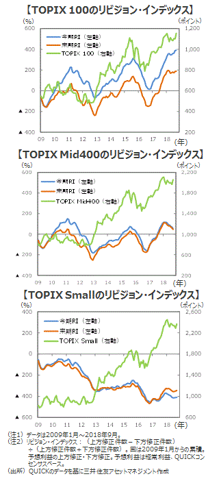 ■TOPIX 100(大型株)は株価とリビジョン・インデックスの関係が比較的はっきりと確認できます。足元の米ドル/円レートが1米ドル114円台に乗せるなど、輸出企業が多く含まれるTOPIX 100の業績には追い風になりそうです。ただ、米中貿易問題や日米通商交渉は年明け以降に議論が加速することから、不透明感が残ります。