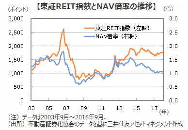 ■一部にはJリートは割高との声も聞かれます。ただし、NAV倍率(リート価格が保有不動産の正味の価値に比べて何倍かを示す指標)は、2018年9月末で1.06倍と、概ね1倍程度での横ばいの動きとなっており、割高感はありません。