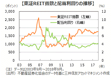 ■また、東証REIT指数配当利回りと10年国債利回りを比較してみると、2013年9月では約3%の利回り差だったのに対し、2018年9月では約4%と、低金利下でJリートへの投資妙味が増していると言えます。為替リスクのない高利回り資産として注目されているものとみられます。
