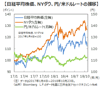 ■当面は米中間選挙の結果が待たれます。米国は中国にとどまらず、トルコ、サウジアラビア、ロシア、ドイツなどに対して政治的な圧力を強める方向にあります。こうした経済・安全保障面での米国の対立姿勢は、中間選挙後も続く可能性は高く、日本株式市場もリスクへの抵抗力を試される展開が続くと思われます。