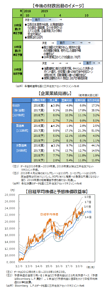 ■具体的には、18年度第1次補正予算で復旧・復興を進めたうえで、第2次補正予算で国土強靭化、19年度当初予算で消費増税対応と、切れ目のない財政出動を行うことで、景気を下支えする方針です。加えて来年7月には参議院選挙が控えています。経済を腰折れさせないための政策が打たれるとの期待が市場心理にプラスに作用すると考えられます。