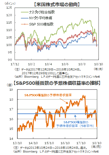■10月24日、米国株式市場はテクノロジー関連株を中心に大幅に下落し、NYダウ平均株価は前日比▲2.4%の2万4,583.42ドル、S&P500種指数は同▲3.1%の2,656.10ポイントで引けました。ナスダック総合指数は同▲4.4%となり、一日当たりの下落率としては2011年8月以来の大幅な調整となりました。