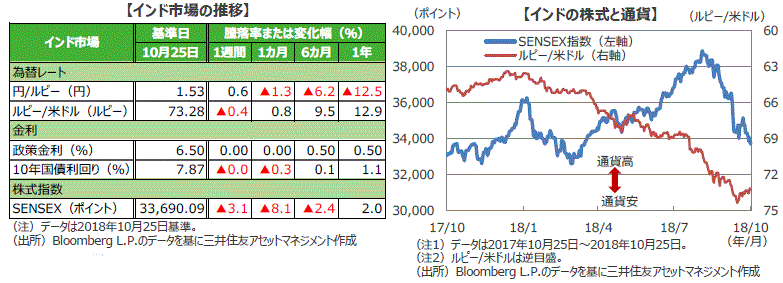 ■インドの株式市場は、下落基調が続いています。主要株式指数のSENSEXは8月28日に過去最高値をつけた後、調整局面に入り、10月25日には約半年ぶりの水準まで下げ、この間の下落率は▲13%となりました。9月以降インドルピー安の加速に伴う資金流出懸念や、インドの大手ノンバンクがデフォルト(債務不履行)を起こしたことに伴う信用不安の高まりで下落していたところに、10月に米株式相場が急落したことを受けて、投資家のリスク回避姿勢が強まり、幅広い銘柄に売りが出ました。