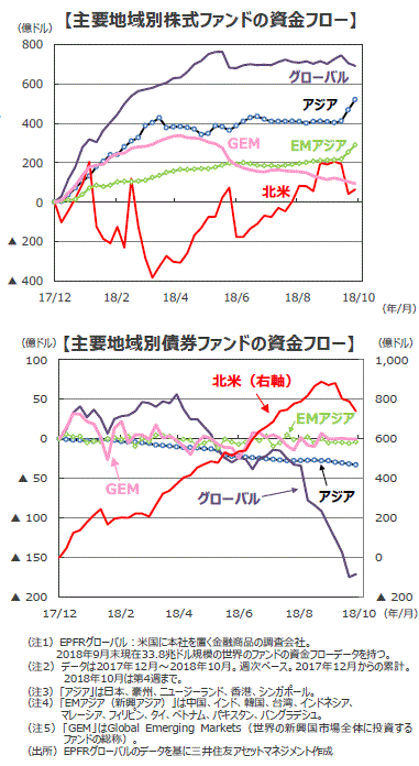 ■先進国は▲101億ドルですが、「アジア(注3)」は113億ドルの大幅な流入超となりました。中心は「日本」(118億ドル)です。10月第3週(58億ドル)、第4週(53億ドル)と大幅な流入超となりました。また、「北米」は▲128億ドルの大幅な流出超となりましたが、10月第4週には22億ドルの流入超に転じました。