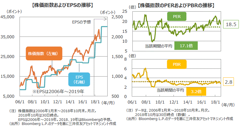 ■ブルームバーグによれば、10月30日時点のSENSEX指数の1株当たり利益(EPS)見通しは、2018年が前年比+26.3%、2019年が同+21.8%と、20%台の伸びが続くと見込まれています。また、同指数の予想株価収益率(PER)は18.5倍と、これまでの株価調整により、過去平均の17.1倍に近づいています。株価純資産倍率(PBR)は2.8倍となっており、過去平均の3.2倍をやや下回っています。インド経済の高成長の下で、2018年以降の力強い利益の伸びを勘案すると、株価のバリュエーションに、特段の割高感はないといえるでしょう。