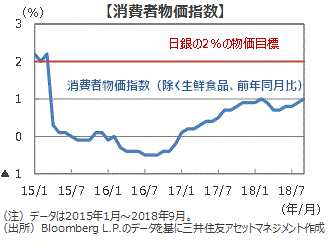 ■9月の消費者物価指数は生鮮食品を除くベースで前年同月比+1.0%の上昇にとどまっており、日銀は2%の物価目標達成に向けて、金融緩和を継続していくとみられます。