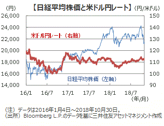 ■日経平均株価は10月に24,270.62円の高値から、米中貿易摩擦の激化懸念などを受けて、一時3,000円を超える下落となりました。日銀の緩和維持は円安に加えて、株価の下支え要因になるとみられます。