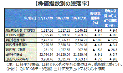 ■2018年10月の日本株式市場は大幅に調整しました。東証株価指数(TOPIX)は前月末比▲9.4%、大型株で構成されるTOPIX500指数は同▲9.3%と下落しました。一方、中小型株では、東証小型株指数(*)は同▲10.6%、東証2部株価指数は同▲4.5%、東証マザーズ指数は同▲15.8%、日経ジャスダック平均は同▲7.0%となり、中小型株指数の下落が目立ちました。