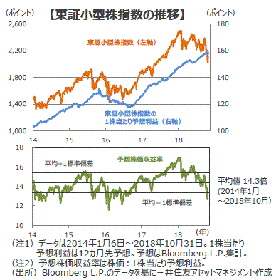 ■小型株指数は、2015年の中国ショック後に大幅な調整局面を経験しました。当時は、1株当たり予想利益の低下が示すように、業績悪化が株価の下落要因となりました。中小型株の業績は2016年後半以降堅調に推移しており、2018年も堅調です。