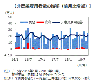 ■2018年10月の非農業部門雇用者数は、前月比25.0万人増となり、ブルームバーグ集計による市場予想の同20.0万人増を大きく上回りました。予想を超える雇用増は、9月の統計が米東海岸を襲ったハリケーンによって下押しされた反動によると考えられます。