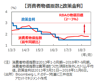■RBAが重視する物価については、改善基調に変化はないとの見方を据え置きました。18年7-9月期の消費者物価上昇率は、異常値を除外したトリム平均値で測って前年同期比+1.8%と、RBAの目標値の下限である+2%を引き続き下回りましたが、RBAは電気代等の管理費の一時的な低下によるところが大きいと評価しています。2019年には+2.25%程度に加速する見通しです。