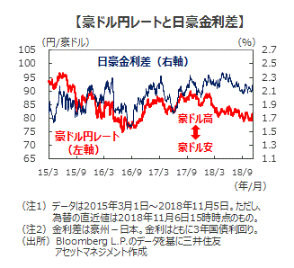 ■豪州の景気が拡大基調にあること、RBAの金融政策が中立姿勢を維持しているのに対して、日銀は緩和姿勢を継続していること等を踏まえると、豪ドルは概ね底堅い展開が見込まれます。ただし、中国の景気動向や、米国の保護主義的な通商政策には注意を払う必要があると考えられます。