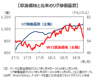 ■北米の代表的な原油価格であるWTI先物価格は、 10月3日の1バレル当たり76.4ドルを当面のピークに下落に転じています。11月12日には節目の同60ドルを割込み、翌13日に年初来安値となる同55.7ドルをつけました。10月3日の高値からは、約27%もの下落となります。