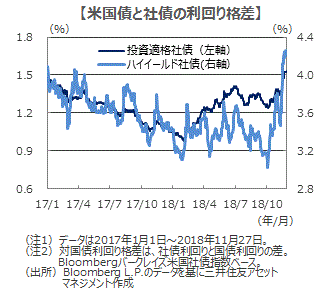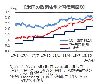 ■11月上旬は10月の雇用統計で雇用者数が上振れたことや、米連邦公開市場委員会(FOMC)で利上げ継続の方針が確認されたこと等から、利回りは上昇しました。ところが、中旬以降は米株価や原油価格の下落、英国の政治混乱と欧州連合(EU)離脱交渉の先行き不透明感の高まり、米連邦準備制度理事会(FRB)高官のハト派的発言を受け利上げ観測が後退したことにより低下しました。