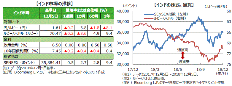 ■インド準備銀行(RBI)は12月5日、金融政策決定会合で政策金利を6.50%で据え置きました。金融政策スタンスについては、引き締め姿勢が維持されました。足元のインフレ率が物価目標の中心値の+4%を下回っていることや原油安から、RBIは2018年10月~19年3月のインフレ見通しを下方修正しました。