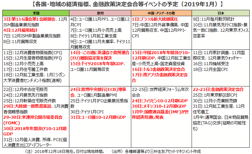 ■ブラジルでは、1日にボルソナロ氏が新大統領に就任します。新大統領の進める財政の健全化などの経済政策が注目されます。中国では、15日に10-12月期のGDP成長率が発表されます。