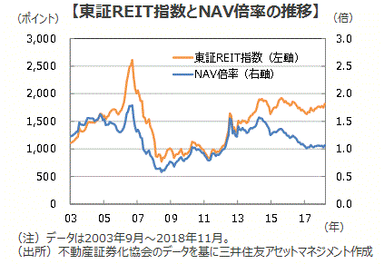 ■NAV倍率(リート価格が保有不動産の正味価値に比べて何倍かを示す指標)は、2018年11月末で1.07倍と、概ね1倍程度で推移しています。