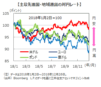 ■春先までは、米中貿易摩擦の激化、北朝鮮および中東情勢の緊迫化等を受け、安全資産である円に資金が集まりましたが、以降は政策金利の引き上げを着実に進めた米国のドルが上昇に転じる一方、ユーロと豪ドル、欧州連合(EU)離脱問題に揺れた英国のポンドは下落傾向を辿りました。年末にかけては貿易摩擦の再燃と、それが世界経済に及ぼす負の影響が懸念され、円に対する選好が強まりました。