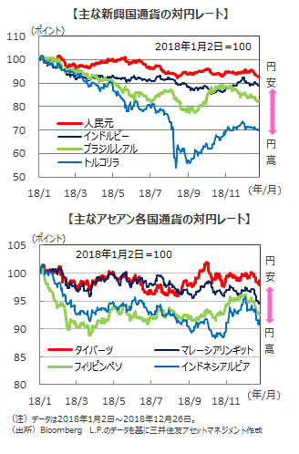 ■米利上げに伴う米ドル高から、対新興国通貨で円高が進みました。8月に米国から経済制裁措置を発動されたトルコのリラが急落した「トルコショック」を受け、新興国通貨は大幅に下落しました。一方、比較的経済の良いアセアン諸国の通貨の対円相場は年初の水準を100とした指数で、概ね90~100の範囲で堅調に推移しました。