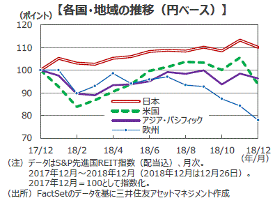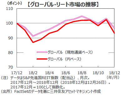 ■2018年のグローバル・リート市場は、米長期金利がやや上昇したことや世界的に株式相場が調整したことから、下落しました。円ベースの騰落率は▲6.7%となっています(12月26日時点)。